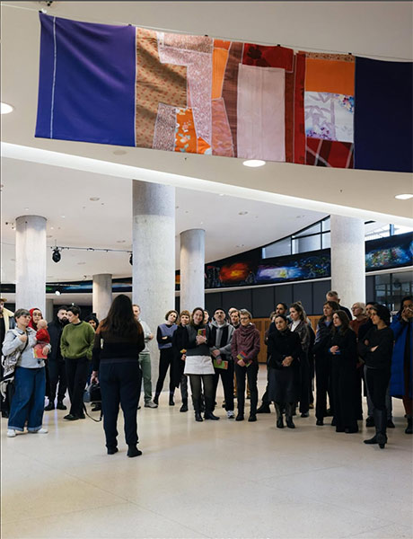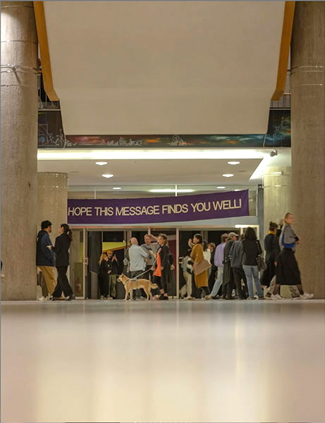 Another form they have made use of is the textile banner, with previous iterations proclaiming twists on political slogans ("Long Live and Thrive Capitalism!", a riff on the ubiquitous "Long Live and Thrive Socialism!" of times gone by), playing with the hollowed out meaning of language in repressive regimes. Yet in our current post-truth universe, the corruption of language and its ability to deliver anything but platitudes can seem like the only common ground. Their newly commissioned work bears a different kind of slogan: "We Hope This Message Finds You Well!". This banal, throw away line - a classic opener of the work email - might rightly induce anxiety. In a world where it feels like everything is falling apart, being "found well" may sound as oxymoronic as the phrase "Long Live Socialism". The political valence of this meaning might be found in the unavoidable dissonance that every viewer will feel: We are not okay, not collectively or individually, and yet spaces to commiserate, much less mobilize, are shrinking by the minute. (Jill Winder)